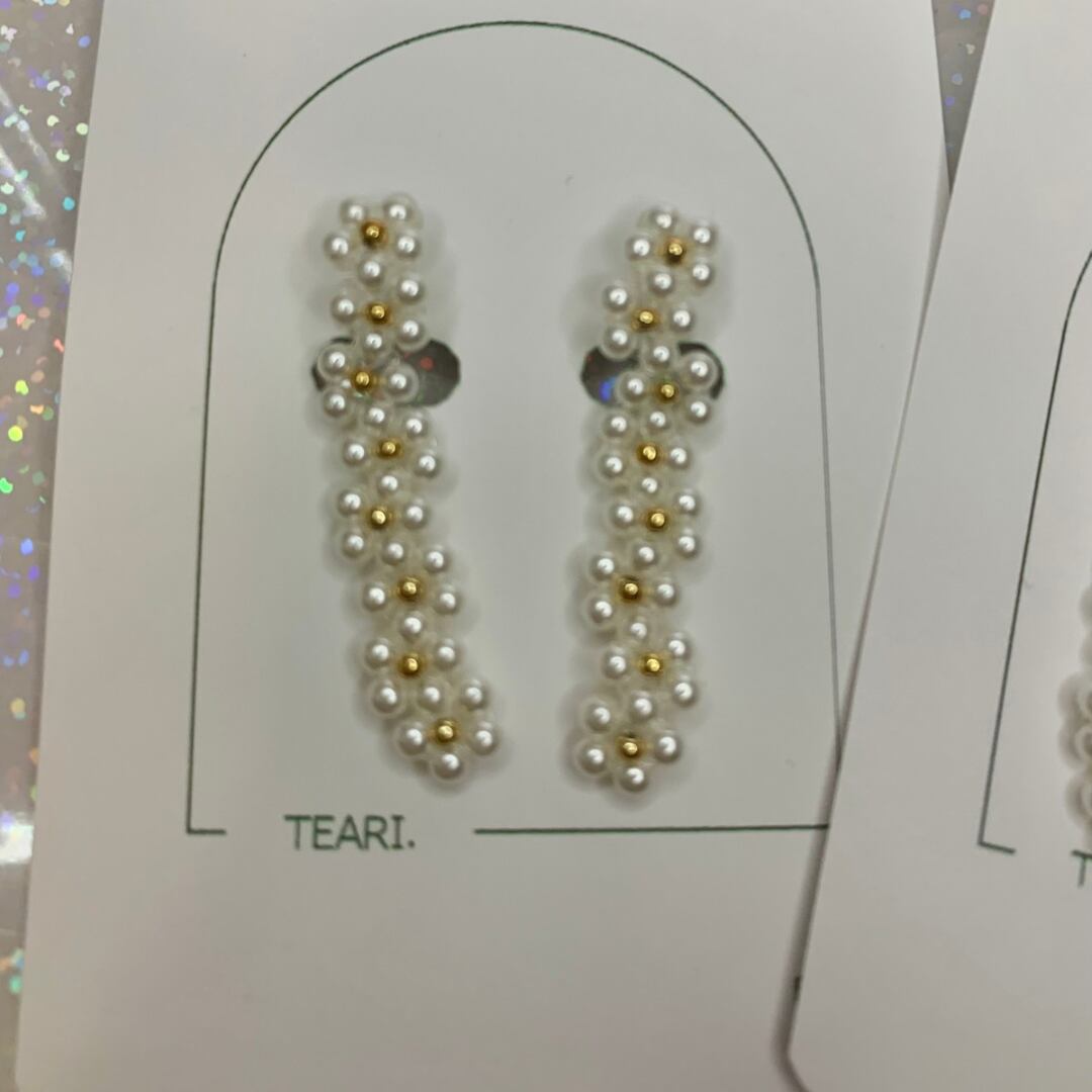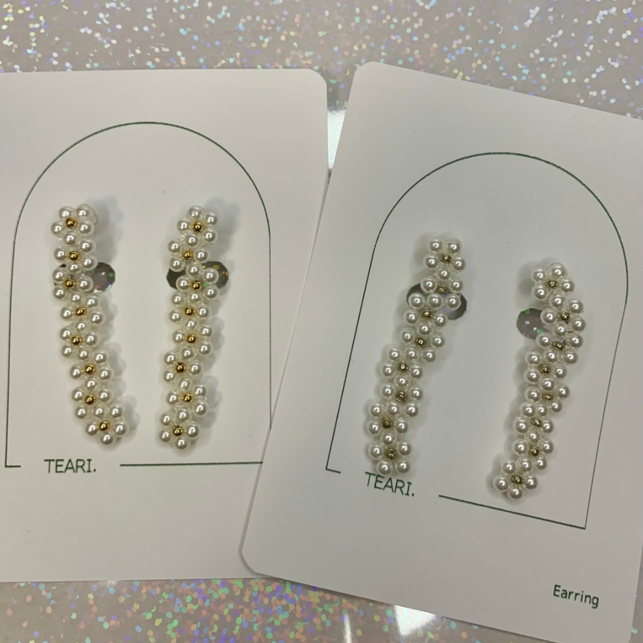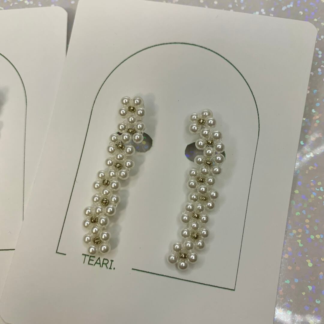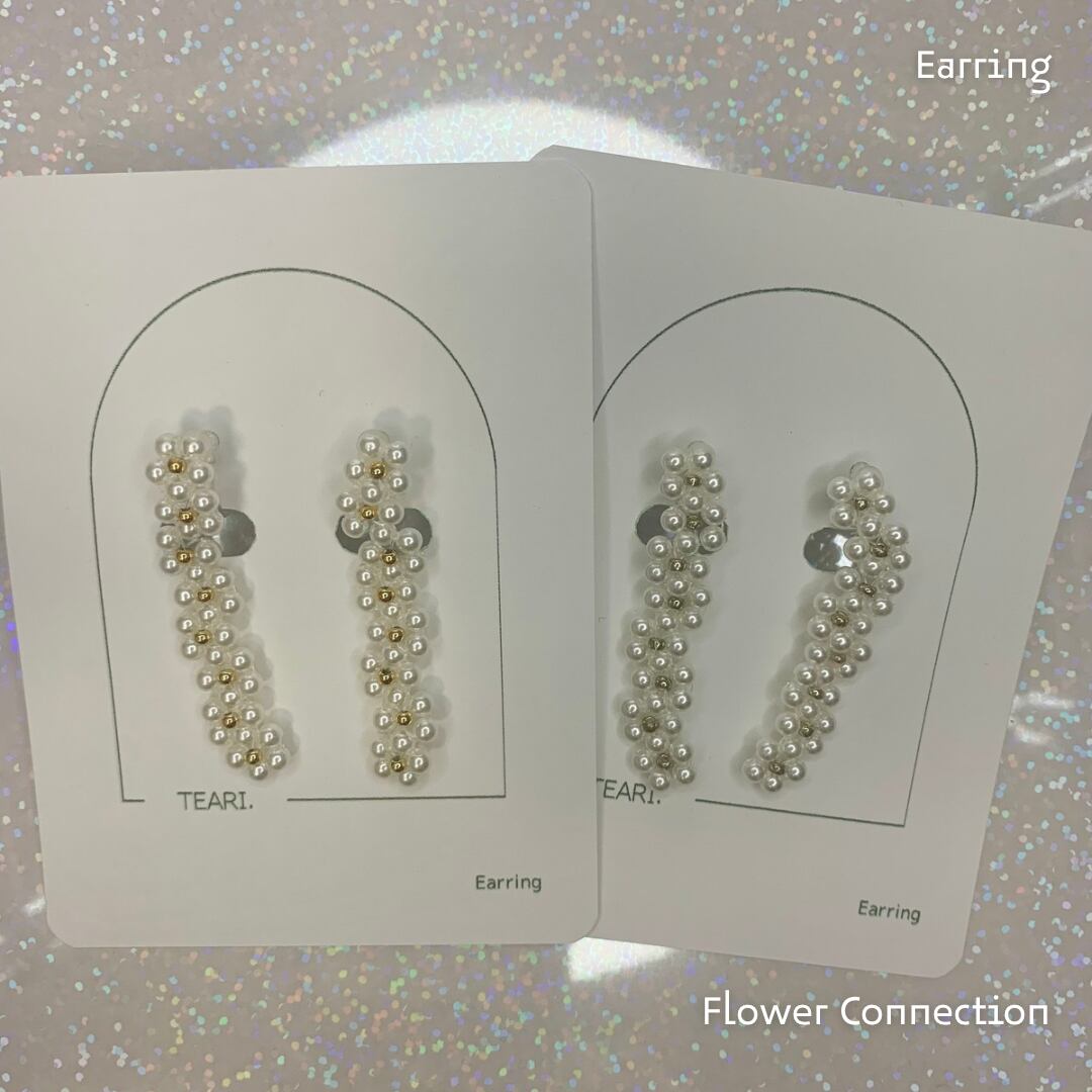 上品なパールビーズを花のように配置した、優美なラインイヤリングです。パールビーズとゴールドとシルバーのビーズを組み合わせることで、華やかさの中に品格が漂う逸品に仕上げました。