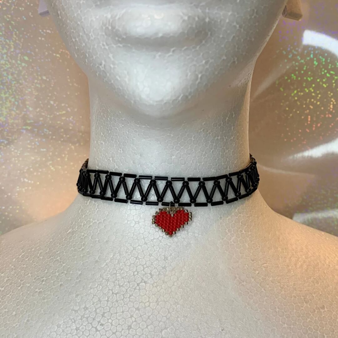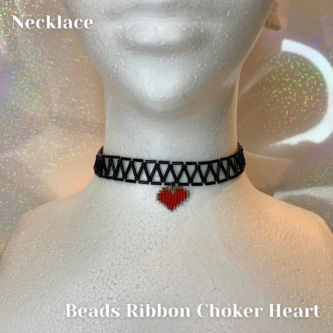 黒い竹ビーズをリボンのように編み、首元にフィットするチョーカーを作成しました。通常のリボンチャームより爽やかな印象に。ハートのステッチチャームもポイントです。