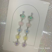 フロスティな半透明の花びらに、優しいパステルカラーの花芯が輝くロングイヤリング。ミント、ピンク、ブルー、イエロー、ラベンダーと、春の虹のような優美なグラデーションが耳元で揺れます。