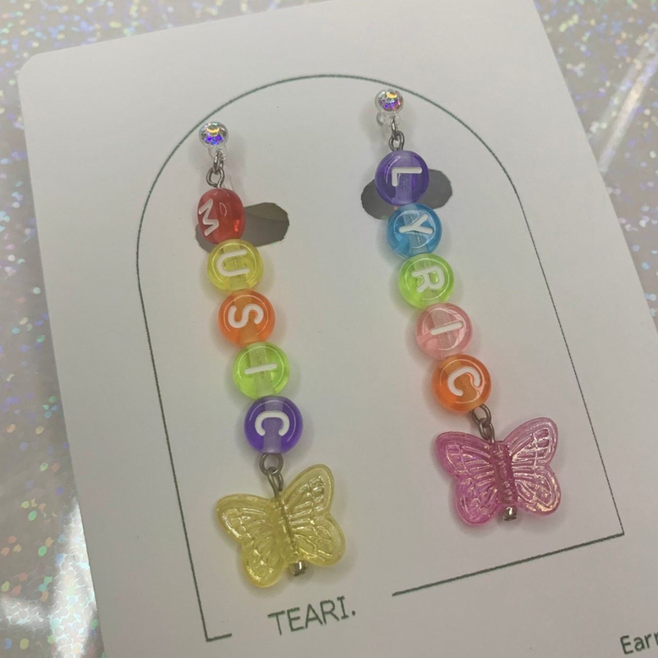 カラフルなアルファベットビーズと透明感のある蝶々チャームが織りなす、ポップでキュートなイヤリング。虹色に輝くオーロラストーンがアクセントとなり、遊び心とガーリーさを演出します。