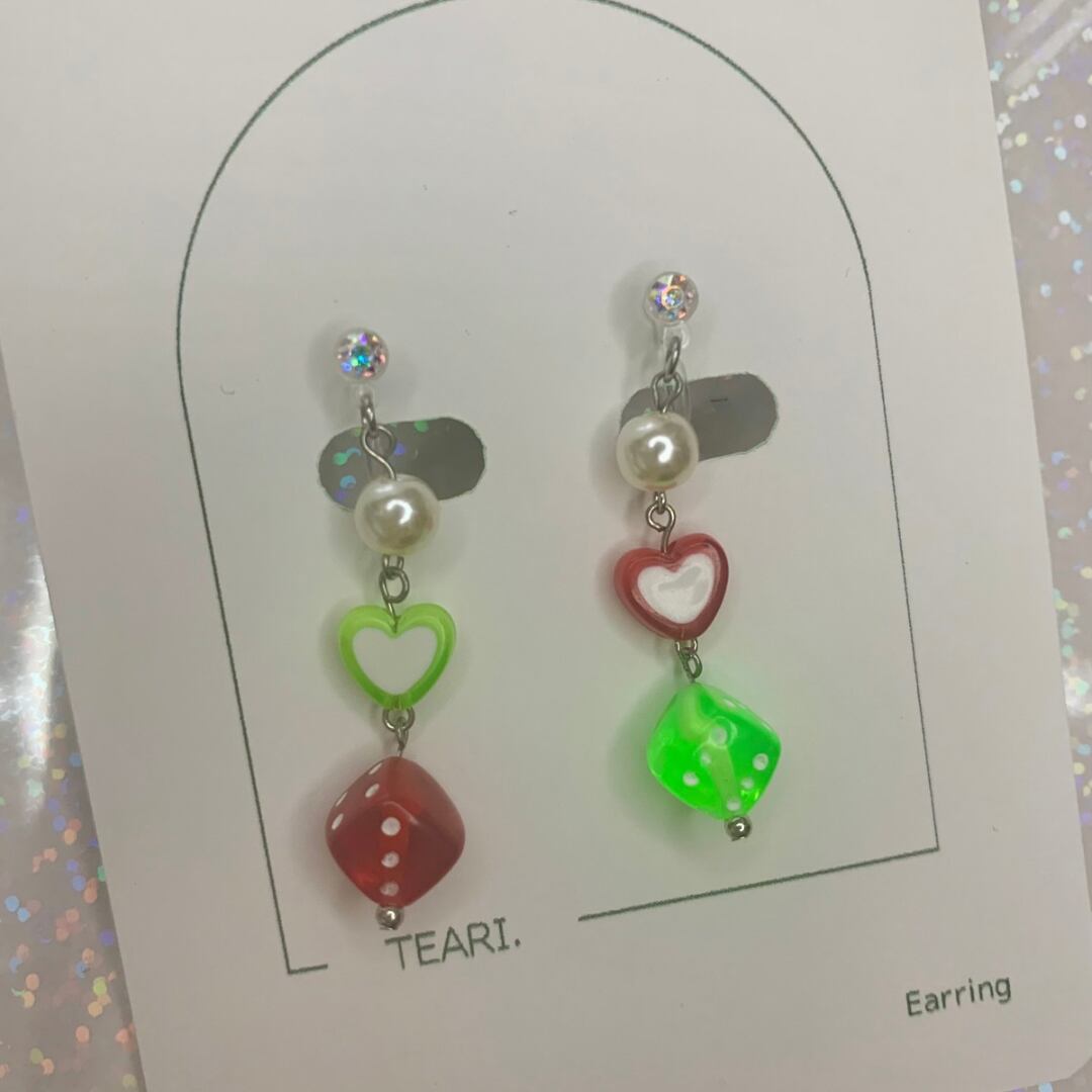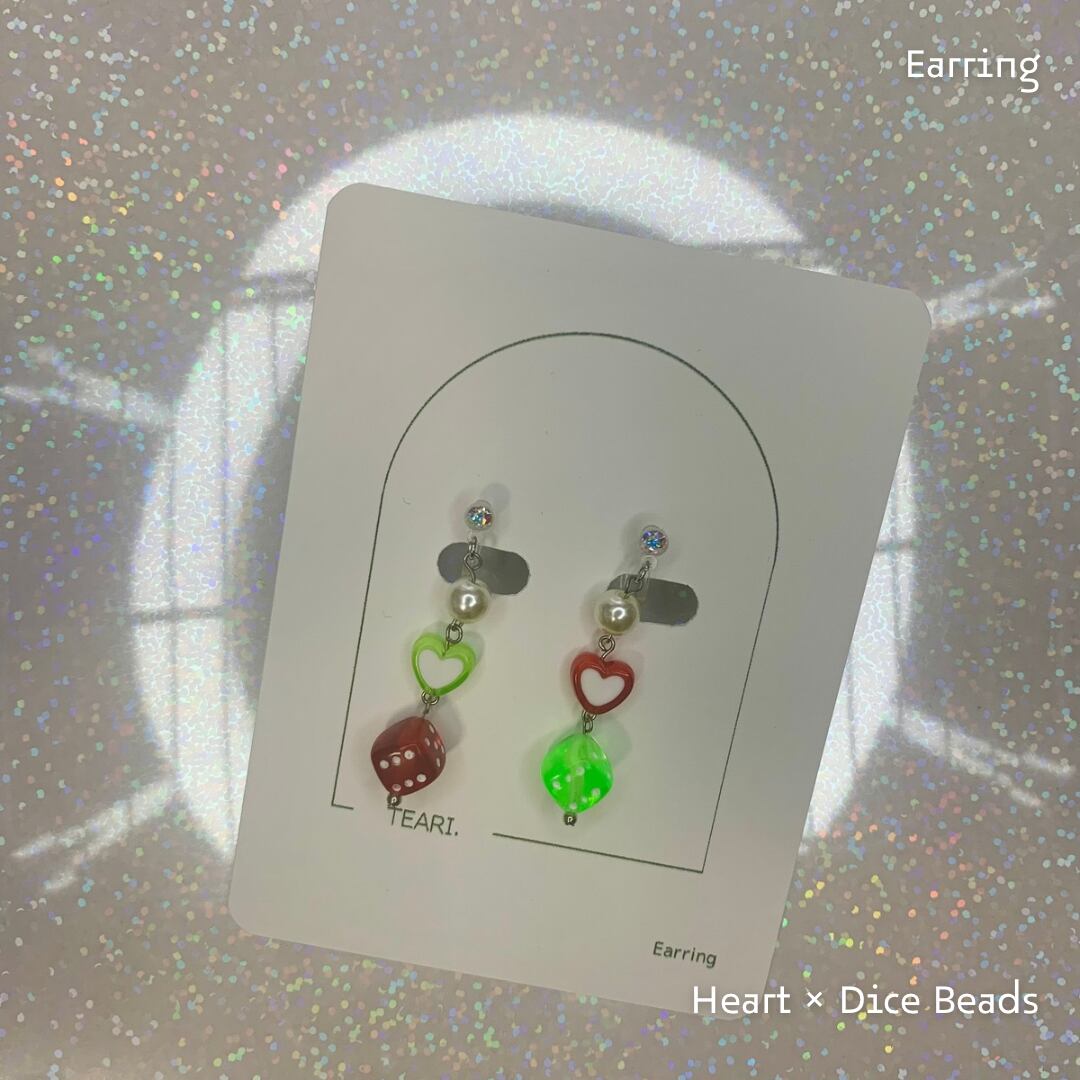 遊び心溢れるサイコロモチーフと愛らしいハートビーズ、上品なパールビーズが織りなす個性的なイヤリング。クリアカラーのサイコロとハートが光を通して輝き、左右で異なるカラーリングがポイントです。