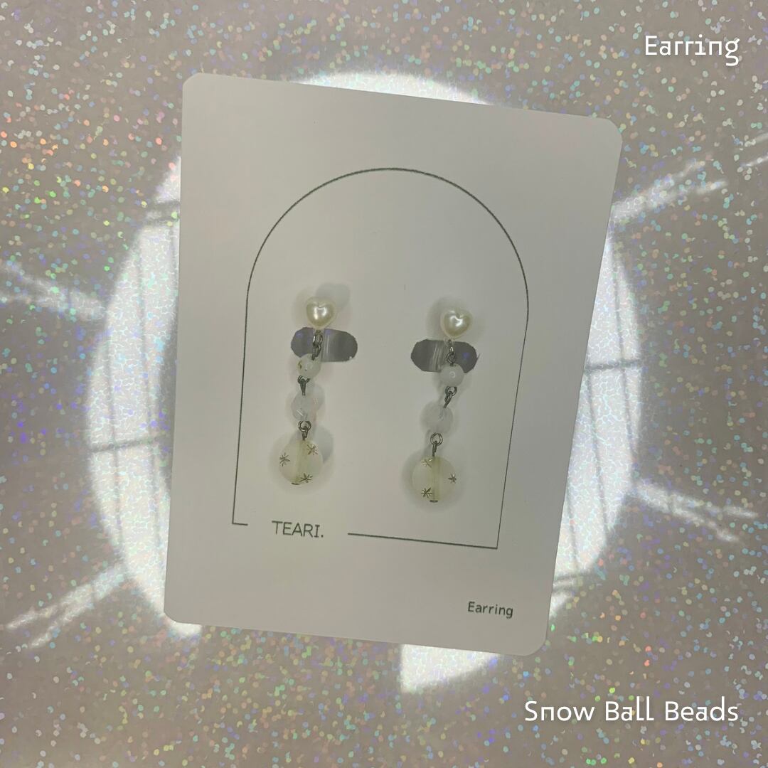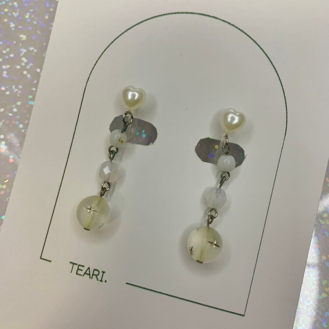 夜空の星をイメージした、繊細で上品なドロップイヤリングです。ハートシェイプのパール風パーツから、クリアビーズを経て、星模様の入ったラウンドビーズへと続くデザインは、まるで天の川のような輝きを放ちます。