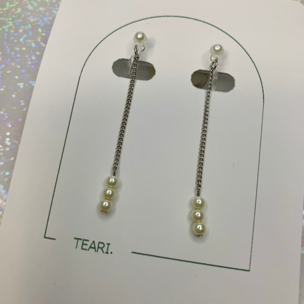 シンプルながら洗練された、パールビーズとチェーンのコンビネーションが魅力的なロングイヤリングです。