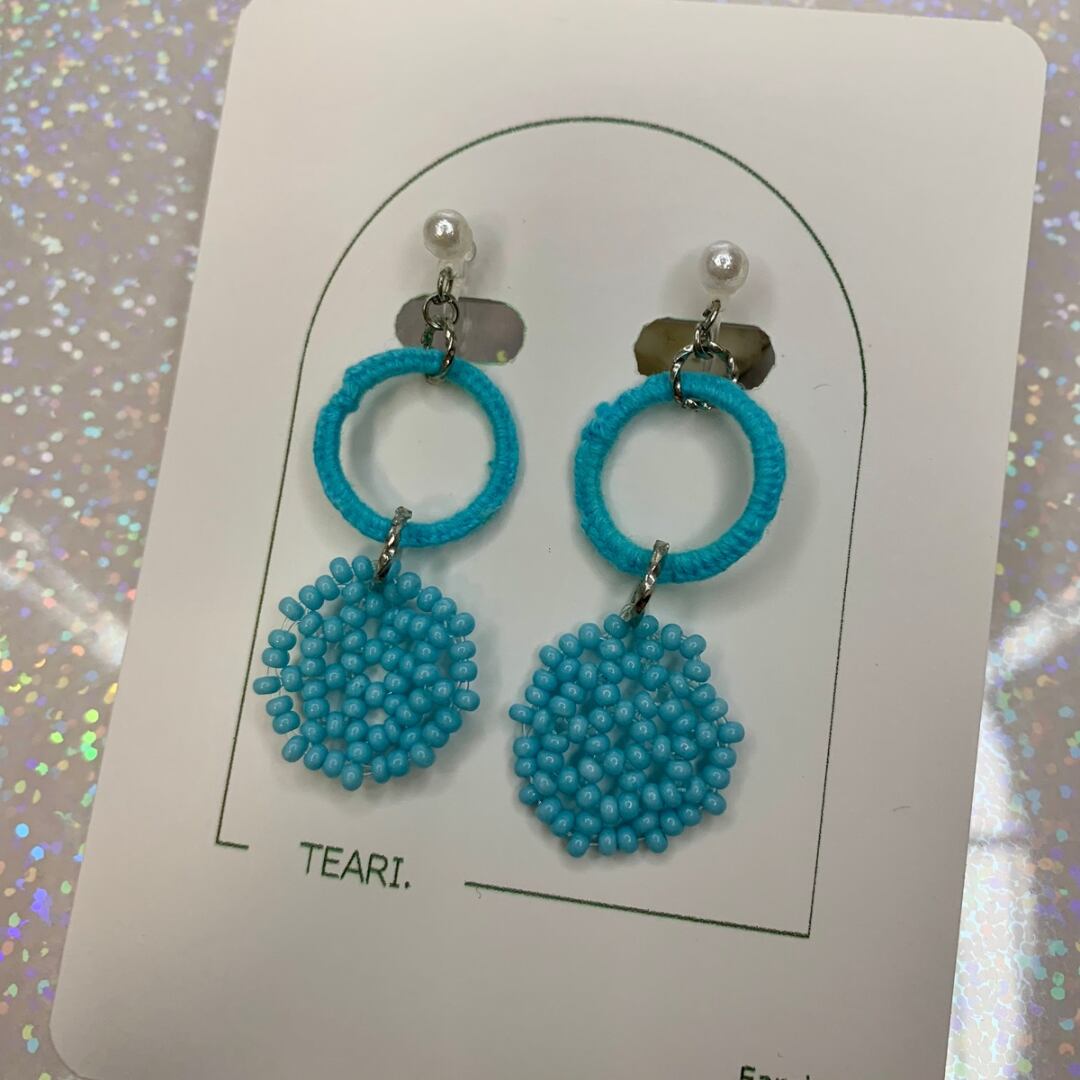 鮮やかなターコイズブルーが目を惹く、サマーシーズンにぴったりのイヤリングです。
