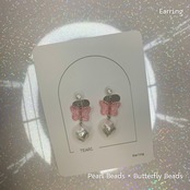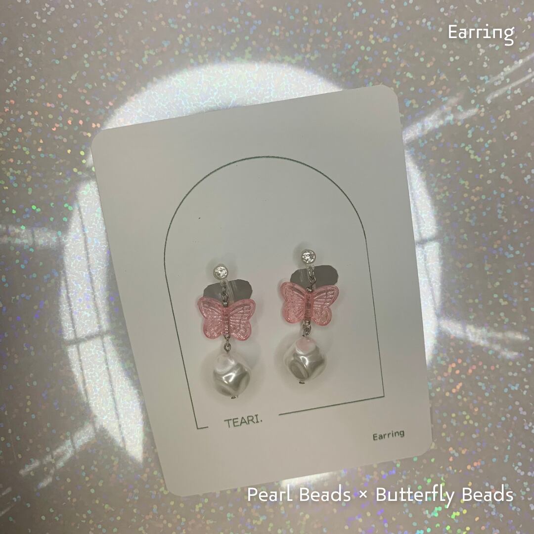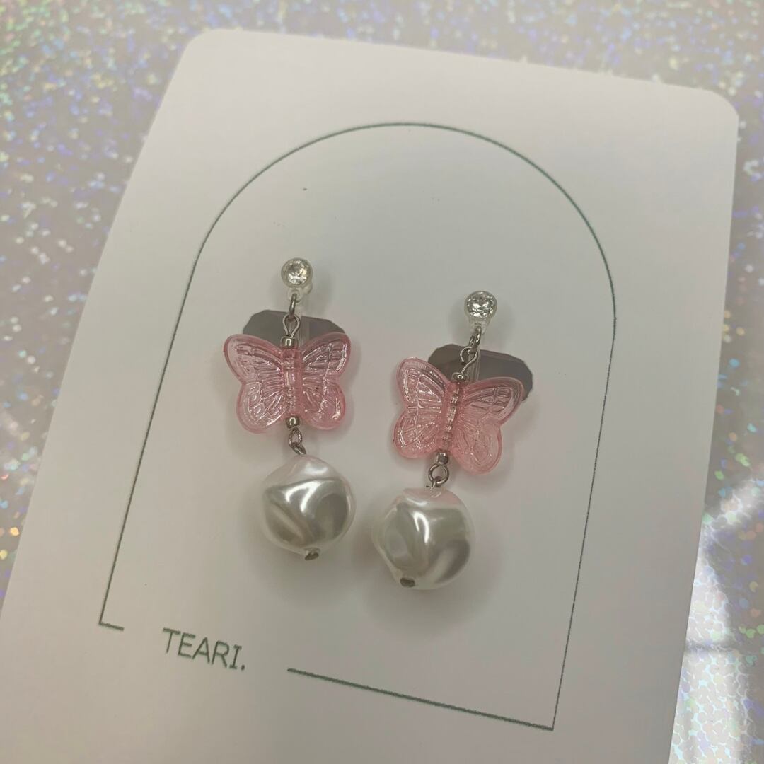 優しいピンク色の蝶モチーフとパールビーズの組み合わせが、春のような可愛らしさを演出するイヤリングです。
