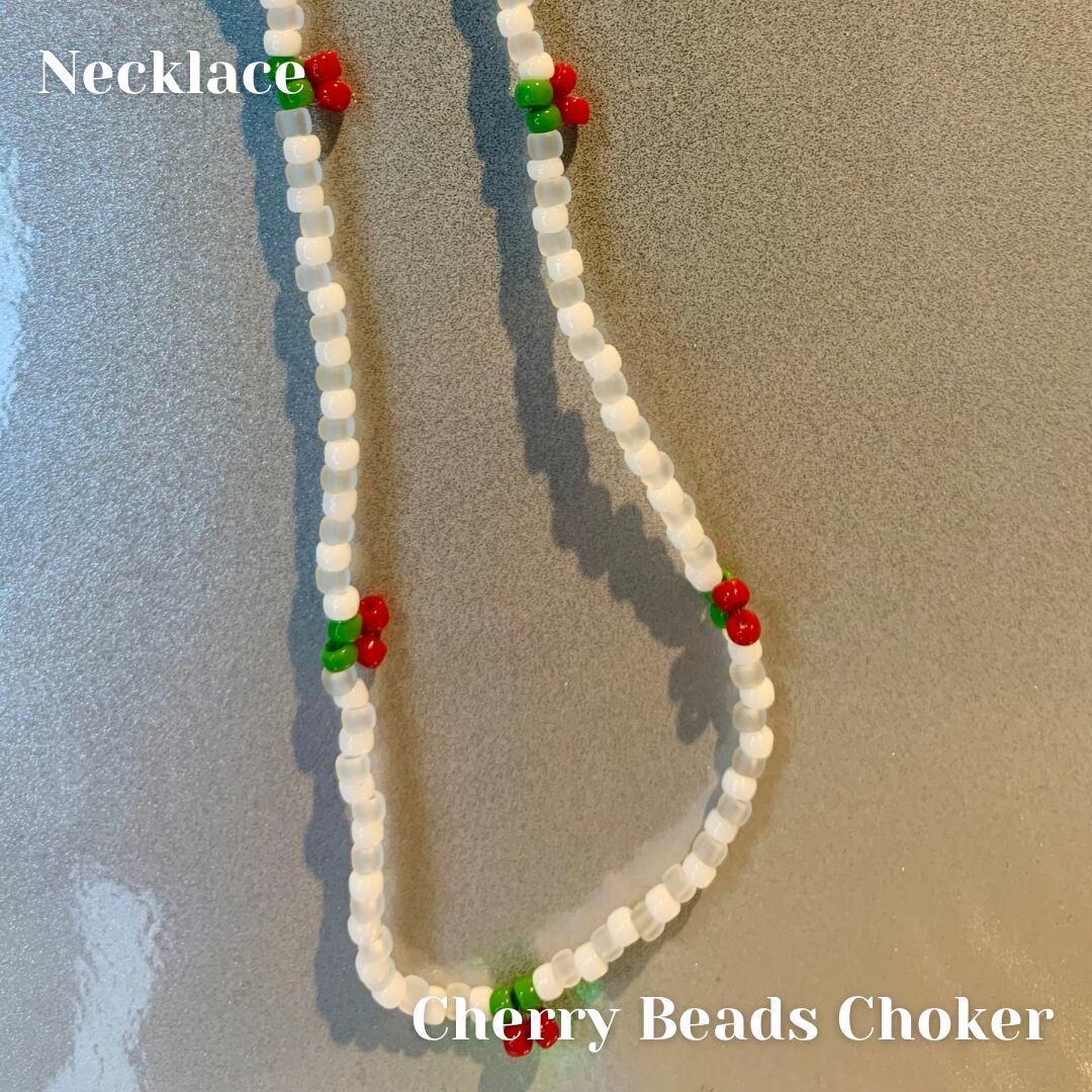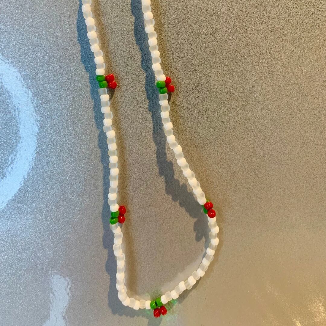 白いビーズと半透明な白いビーズをベースに、さくらんぼのような赤×緑ビーズを組み合わせたかわいいネックレスです。