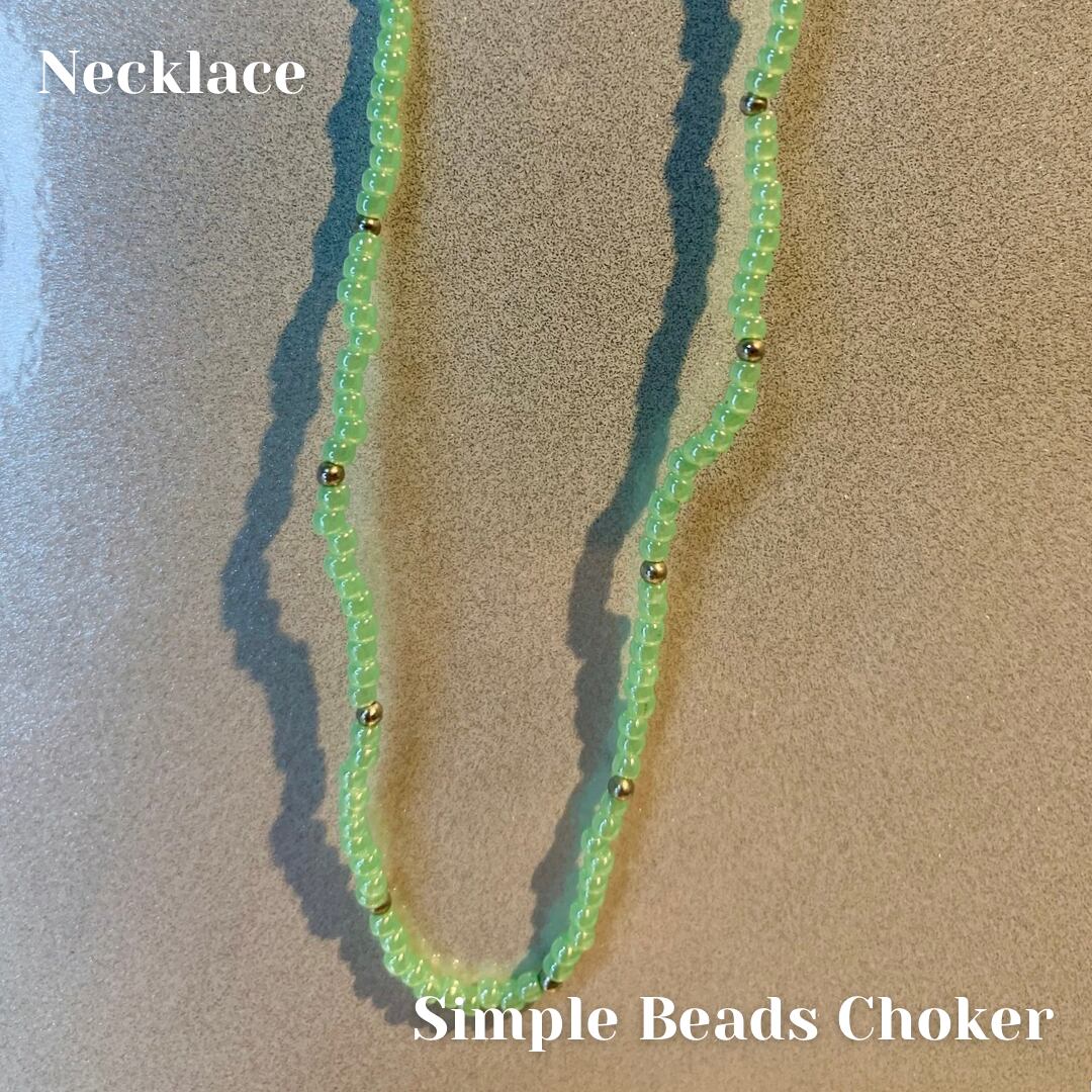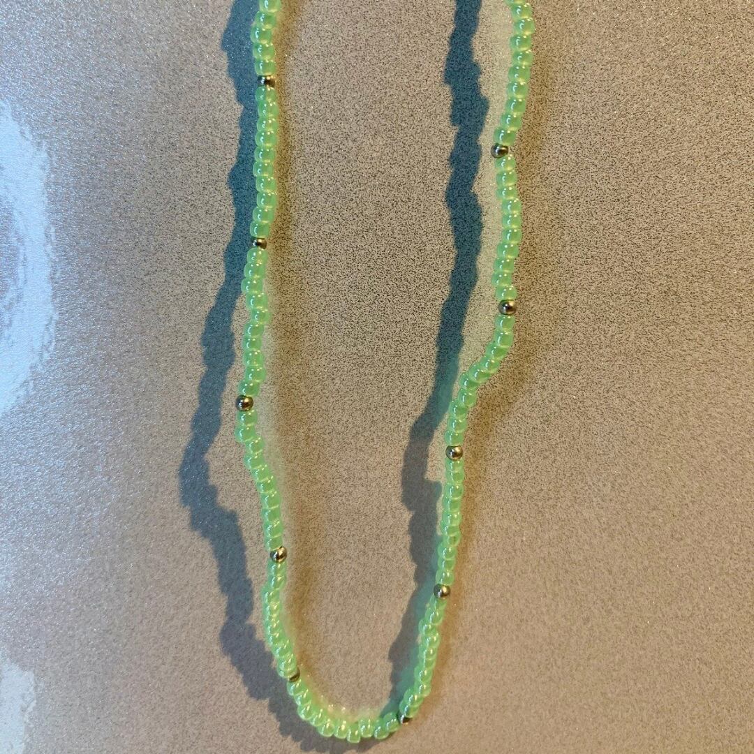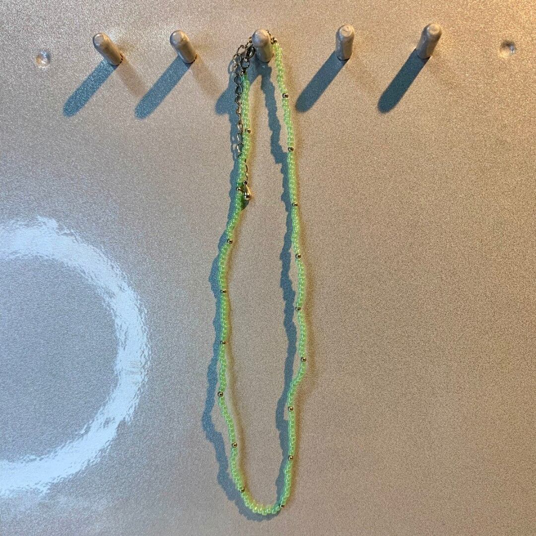 ライトグリーンのビーズにシルバーのビーズをポイントにしたシンプルなネックレスです。