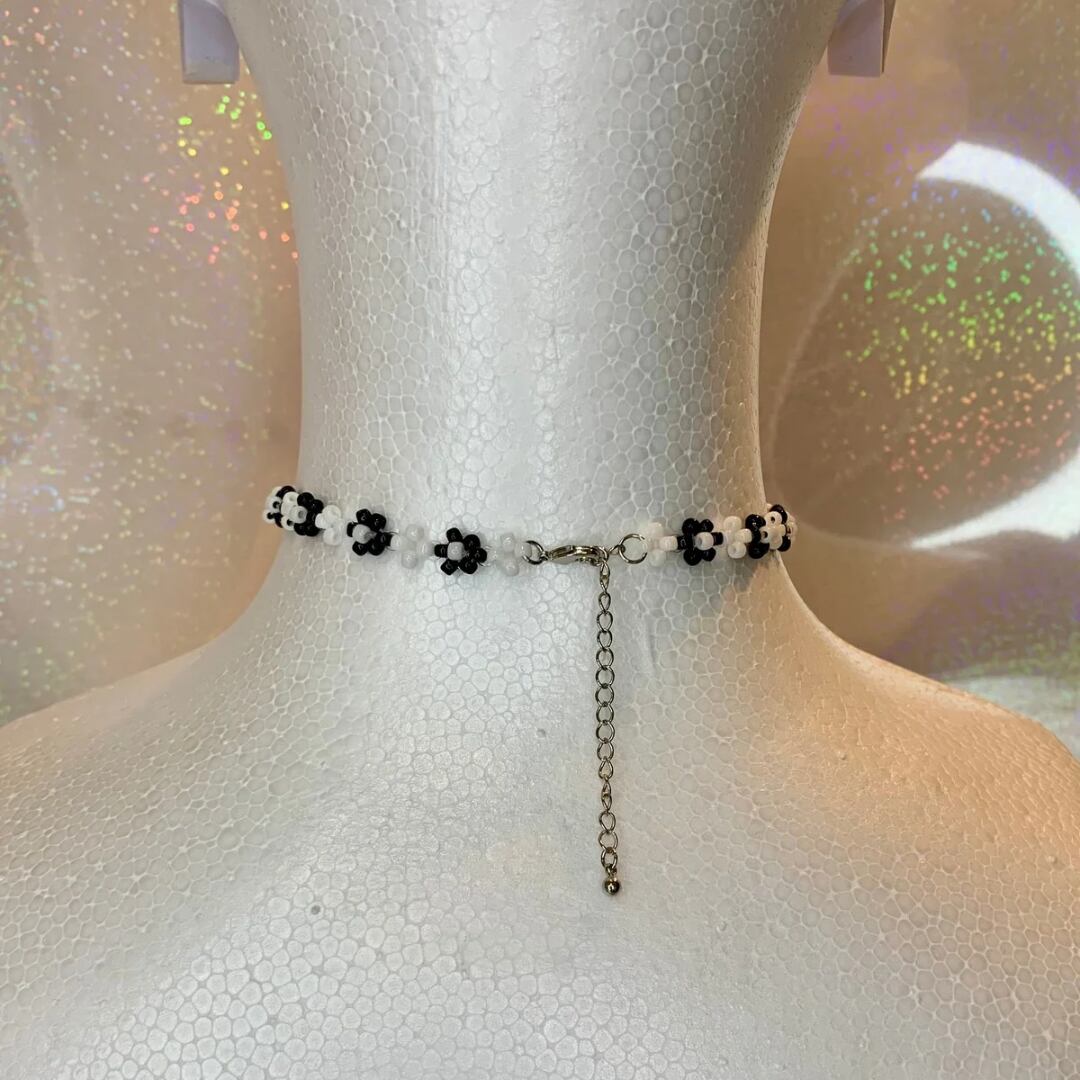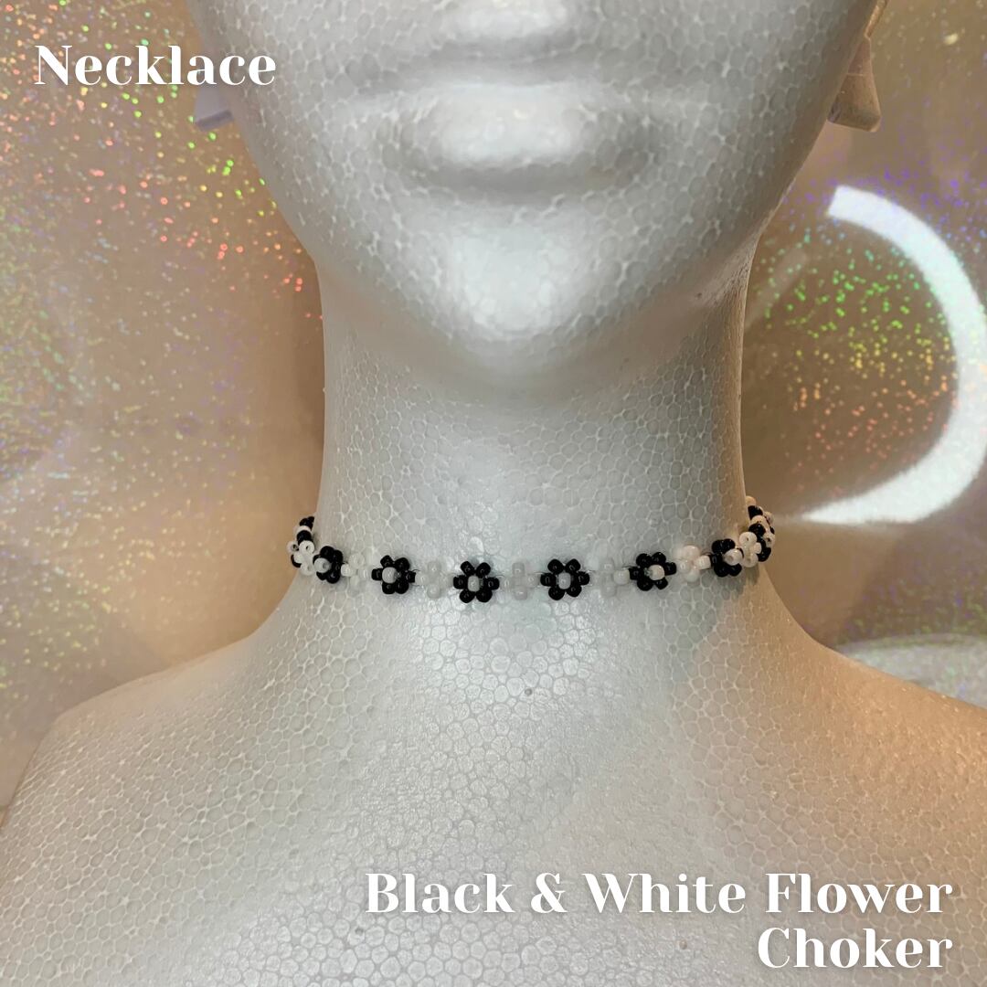 モノクロなビーズでお花がポイントのチョーカーネックレスです。