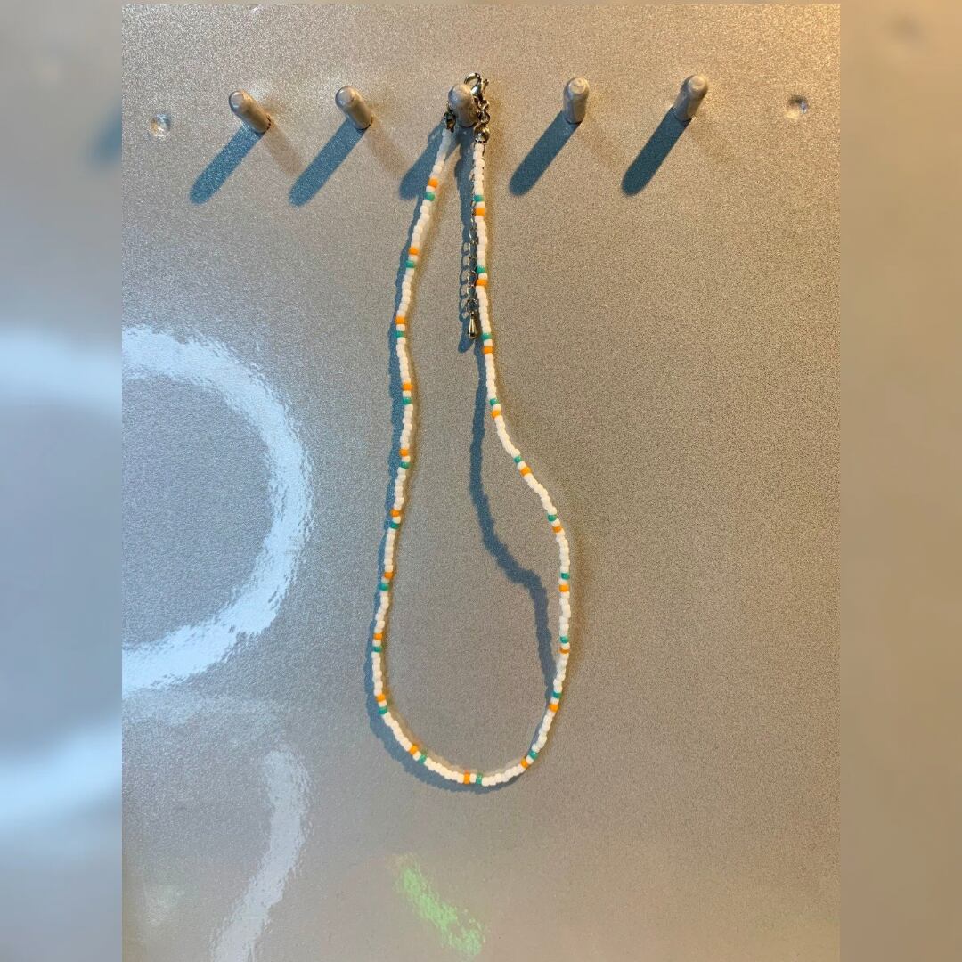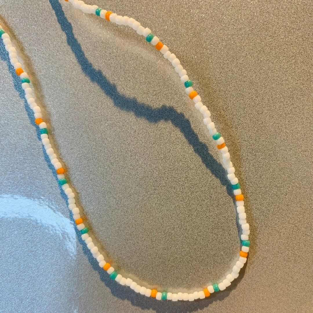 ホワイトをベースにオレンジ×ターコイズのビーズをポイントにしたシンプルなビーズネックレスです。
