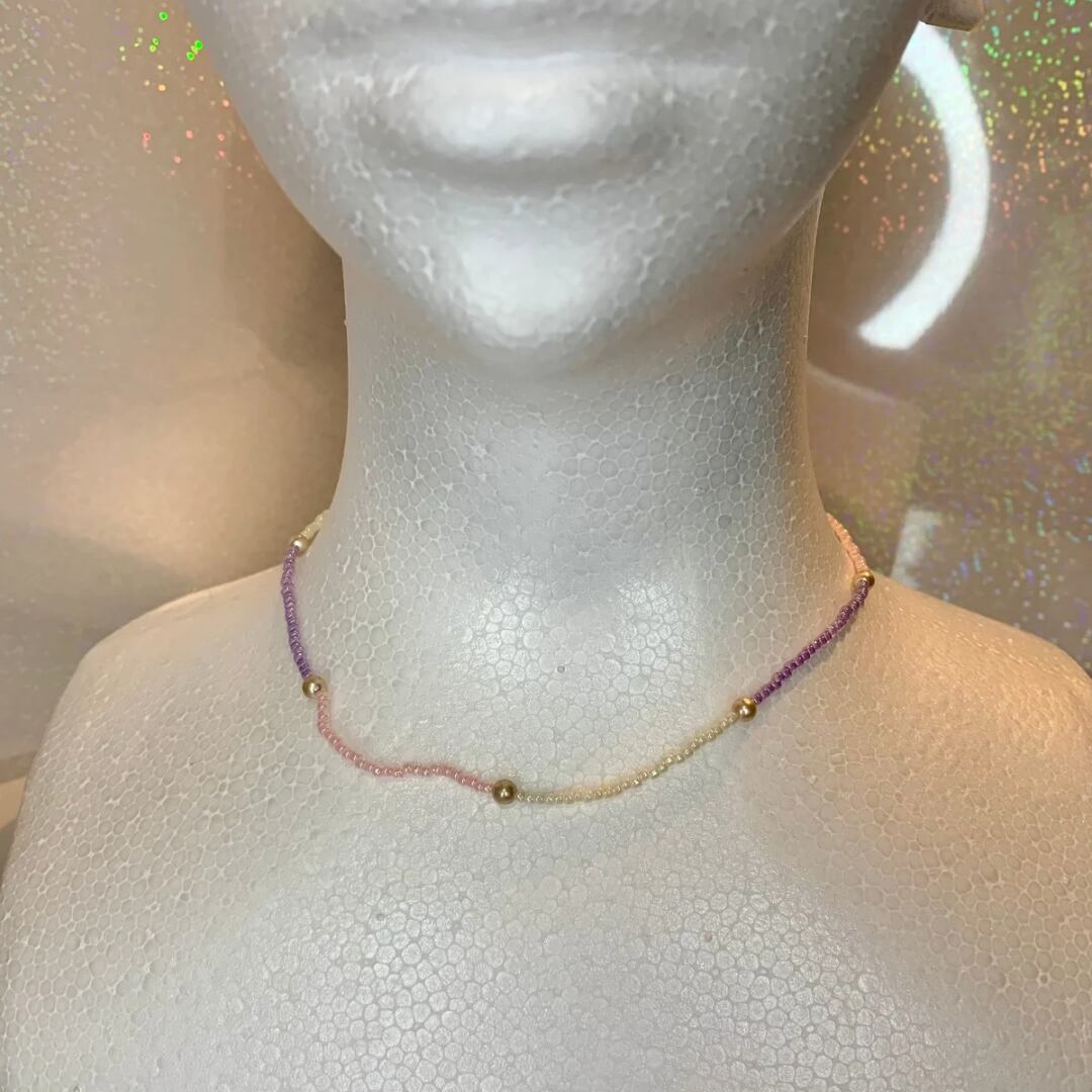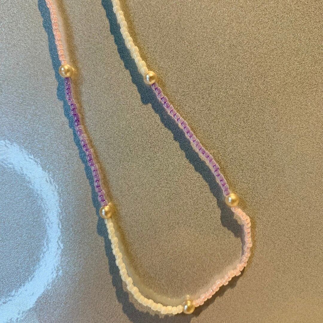 エクリュ×ピンク×パープルのビーズの組み合わせでパールビーズをポイントにしたかわいい色味でまとめたネックレスです。