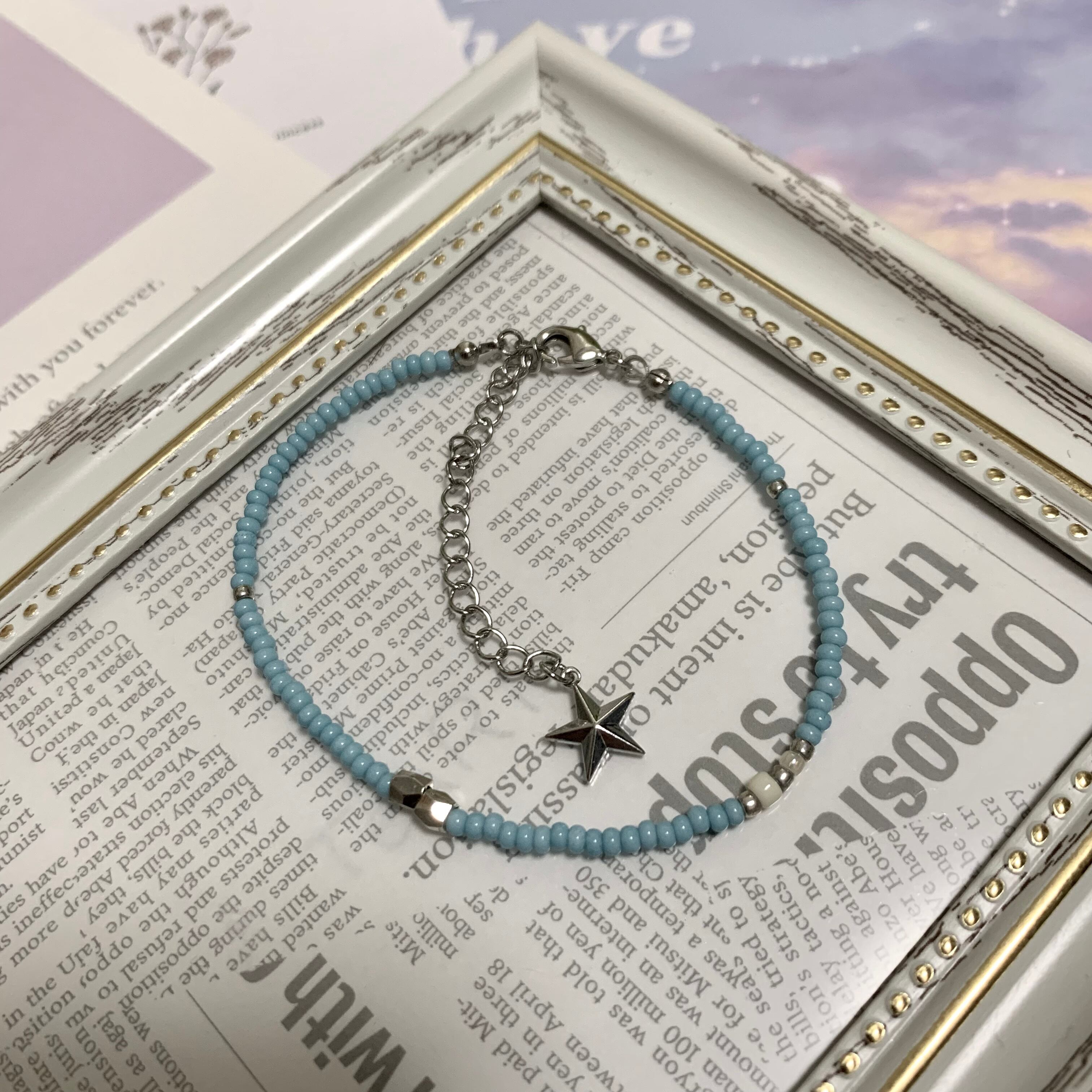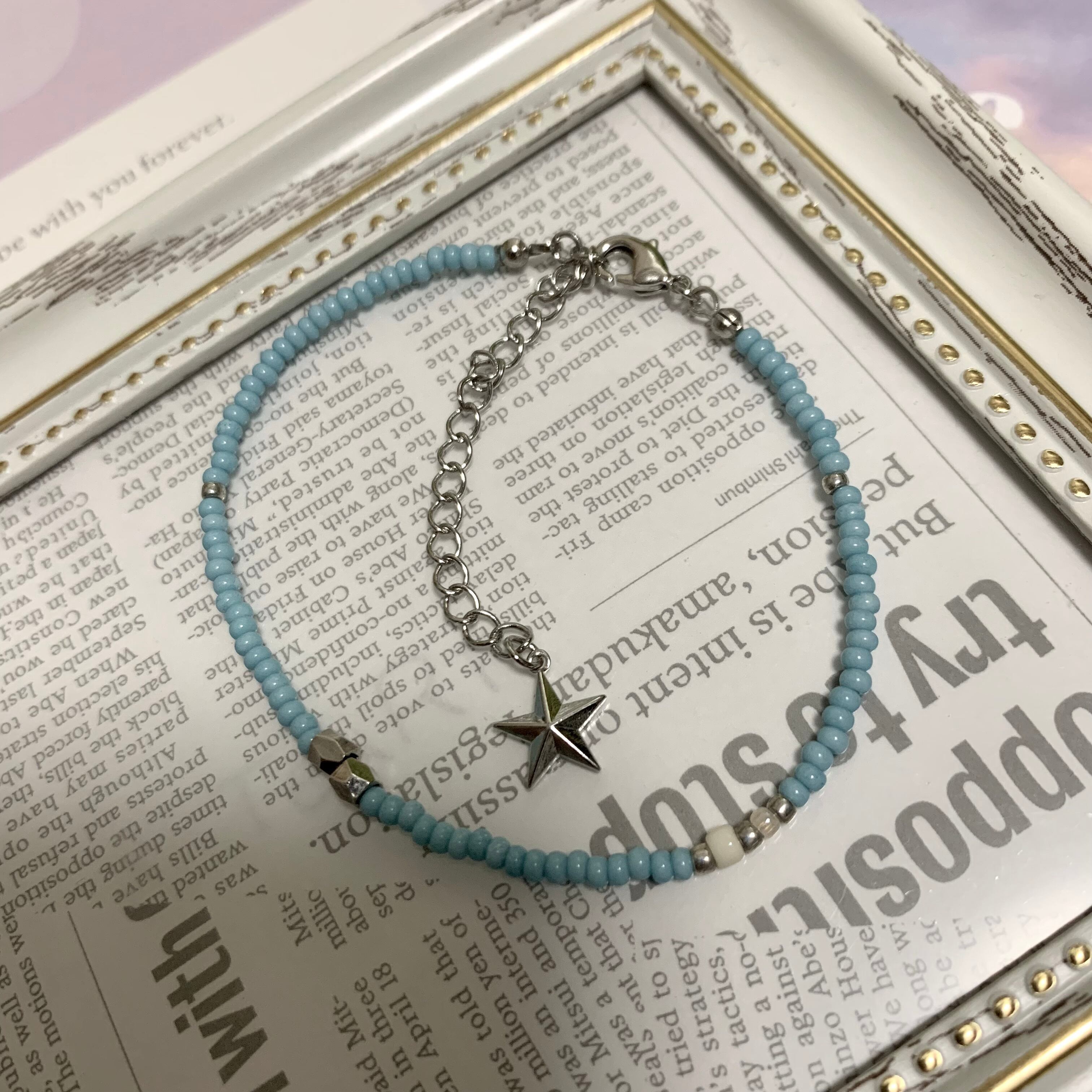 シンプルなターコイズブルーのビーズにシルバーやホワイトのビーズをポイントに挟んだブレスレットです。
